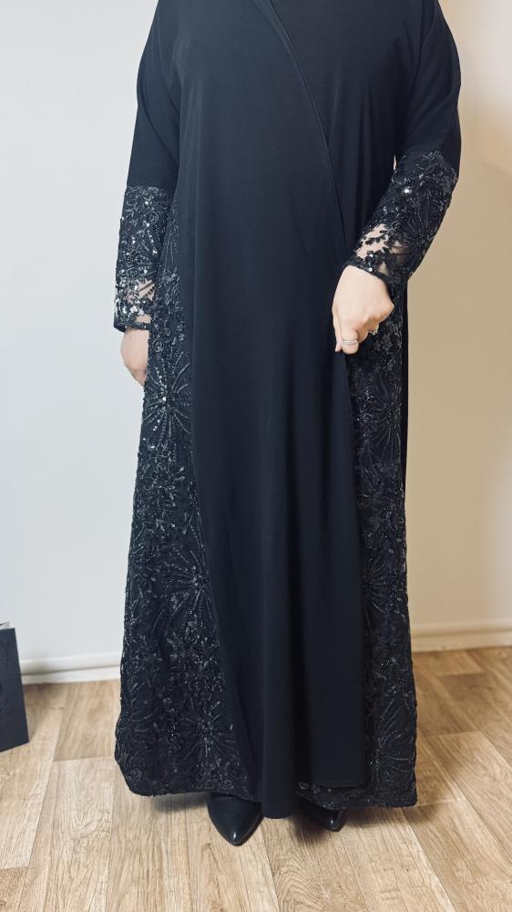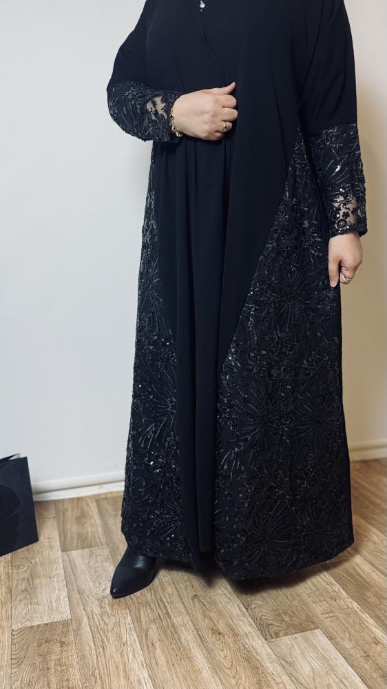 عباية بقماش كريب ملكي كوري مع قماش مصنوع من الدانتيل والشك ع الجوانب والأكمام ا